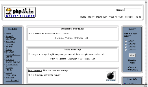 We will analyze all the preinstalled modules in the PHP-Nuke distribution and will give a look also at some very interesting modules that still have not been included in the official distribution. We will differentiate between the 6.0 version and its successors, since there have been important changes starting from version 6.5 - the Splatt forum, for example, has been replaced by the phpBB f.orum, this has created changes in other modules, like Your_Account or Private_Messages, that are now interoperating with phpBB.