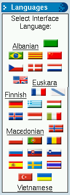 Allows you to change the language of the PHP-Nuke interface. In the Preferences of the administration panel (Chapter 7), you can select whether the block shall display flag icons (Figure 6-13) or a drop-down list for the language selection.