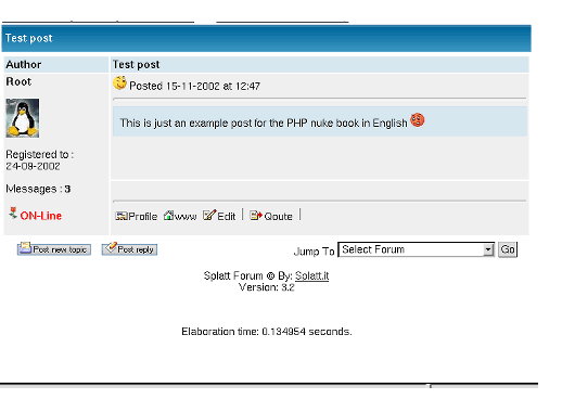 (note: the Splatt forum is included in PHP-Nuke version 6.0, but not in the successive ones, where it was replaced by the phpBB Forum, to be described subsequently).