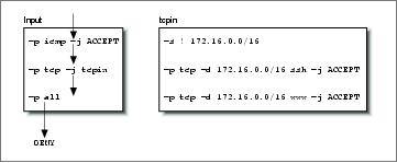 ipchains -P input DENY ipchains -N tcpin ipchains -A tcpin -s ! 172.16.0.0/16 ipchains -A tcpin -p tcp -d 172.16.0.0/16 ssh -j ACCEPT ipchains -A tcpin -p tcp -d 172.16.0.0/16 www -j ACCEPT ipchains -A input -p tcp -j tcpin ipchains -A input -p all |
